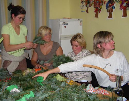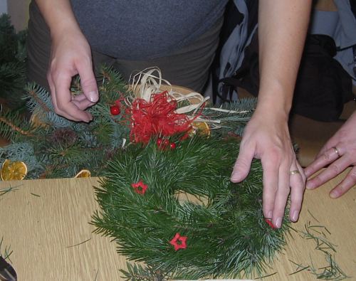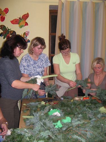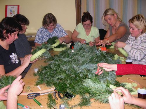 Ve čtvrtek 22. listopadu si deset maminek pod vedením zkušené lektorky Heleny Zápotocké vyrobilo krásné vánoční dekorace. Domů si odnesly věneček ze suchých plodů (například ořechy, bukvice, sušené pomeranče) , který může být hezkým dárkem i celoroční dekorací. Během téměř tříhodinového semináře si maminky "umotaly" i věnec z jedlových a smrkových větví, který některé ozdobily i lýkem, sušenými pomeranči nebo stuhami. Stejnými materiály potom zkrášlily i ramínko. Dověděly se i některé „vychytávky“ a při příjemném povídání, hezký večer rychle uběhl.