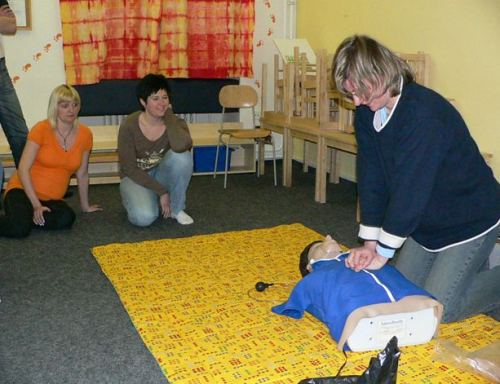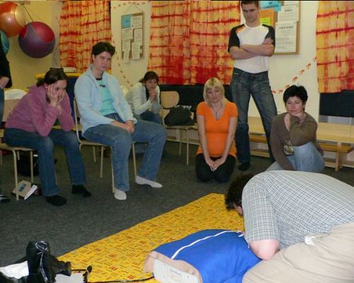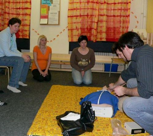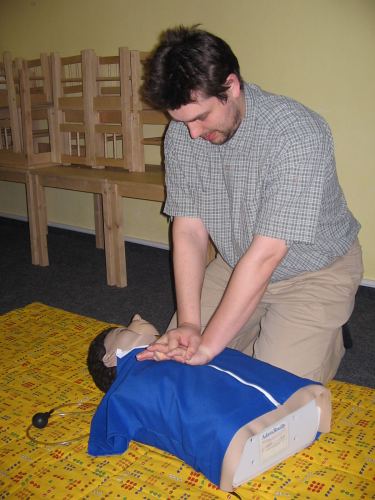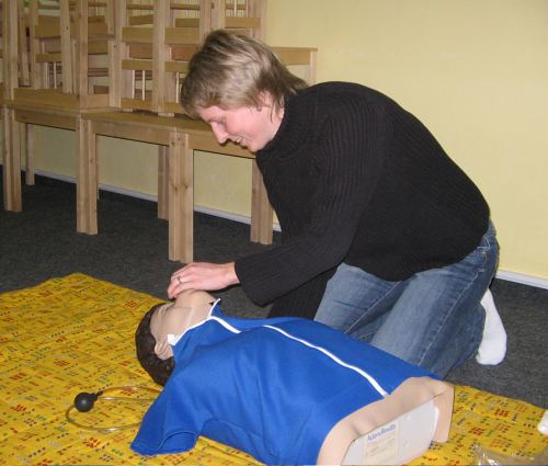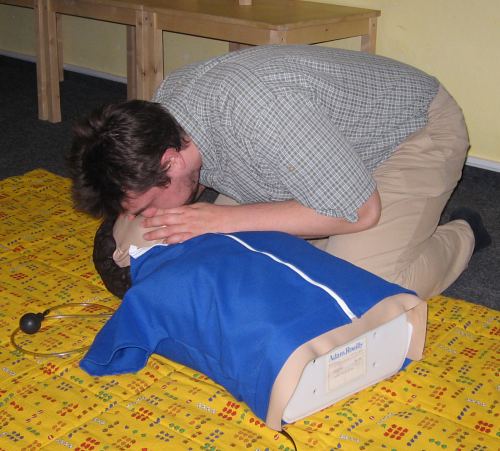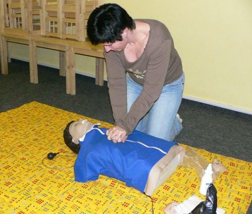 Velkou pozornost přednášející věnoval i poruchám vědomí a hlavně nácviku správného umělého dýchání a masáže srdce. V závěru přednášky si většina přítomných vyzkoušela právě získané teoretické znaosti v praxi na figuríně.