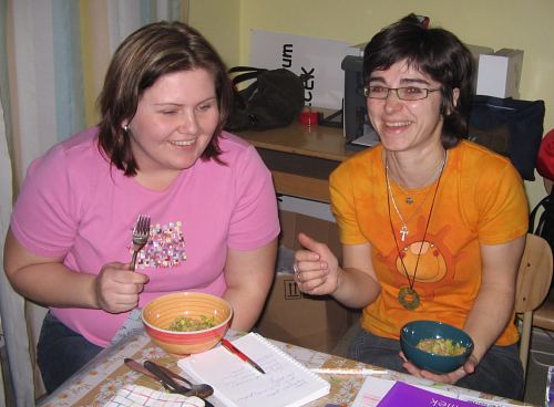 I druhé setkání s úspěšnou zapálenou kuchařkou Lenkou Požárovou ve čtvrtek 28. února bylo plné netradičních chutí. Tentokrát byly na programu netradiční recepty z celeru. Desítce maminek a babiček Lenka Požárová přímo v kuchyňce MC Pemoníček uvařila kuskusový salát s řapíkatým celerem, který ve své nové kuchařce poeticky nazvala Africká královna. Následoval salát z "tradičního" celeru s avokádem. Posledním chodem pak byla lehká banánovo-mátová pěna. Maminky během dvouhodinového příjemného povídání ochutnávaly a přidávaly i svá vylepšení připravených pokrmů. :) V závěru si pak mohly účastnice semináře koupit i zajímavé kuchařky.
