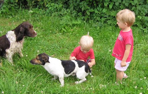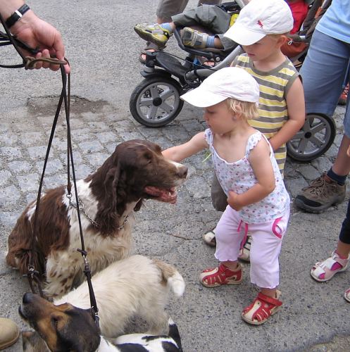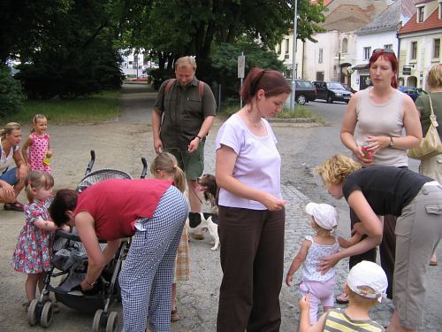Od herny se skupinka doprovázená i třemi psy vydala v horkém letním odpoledni nejprve do parku za muzeem. Tam psi předvedli "lov na kachny". Pak děti poznávaly různá zvířátka na obrázcích a podle zvuků.
