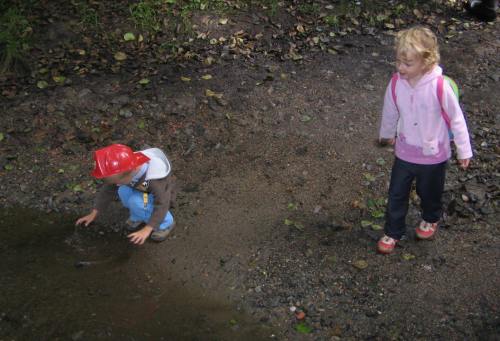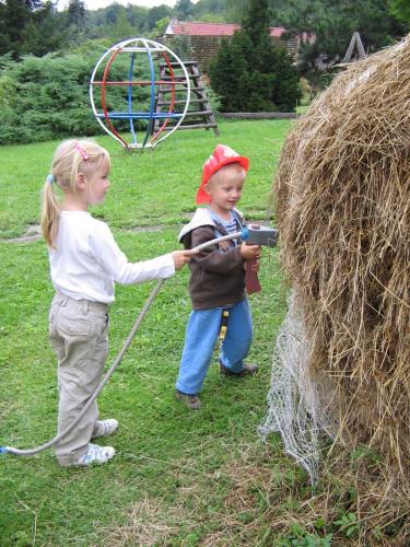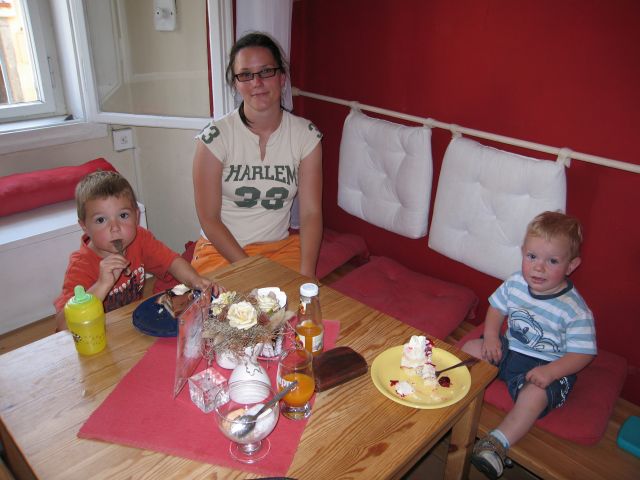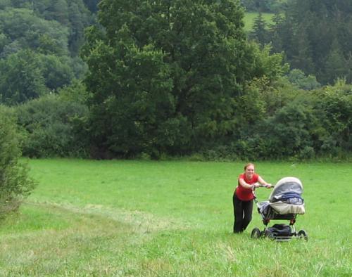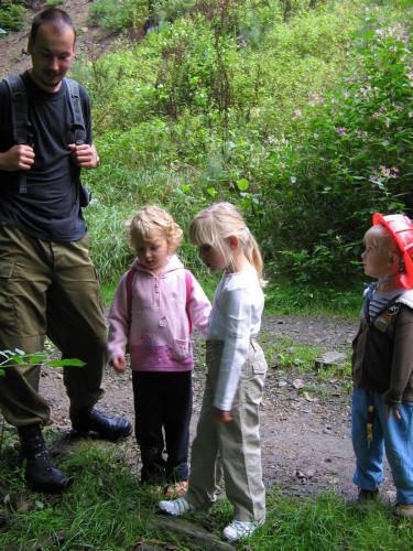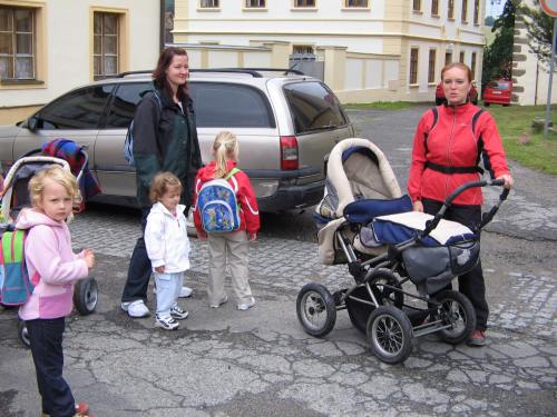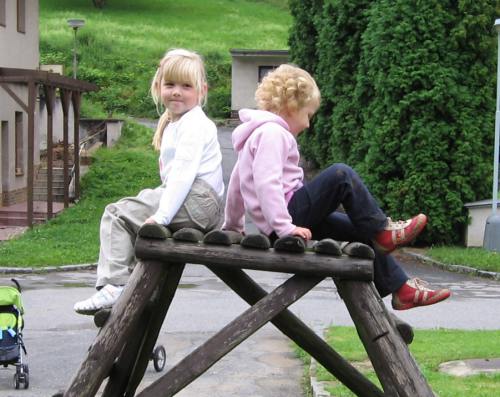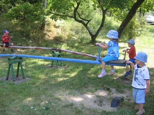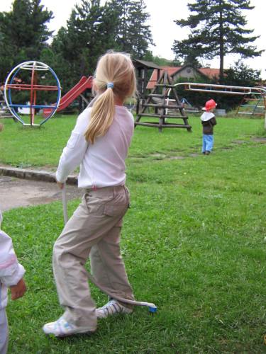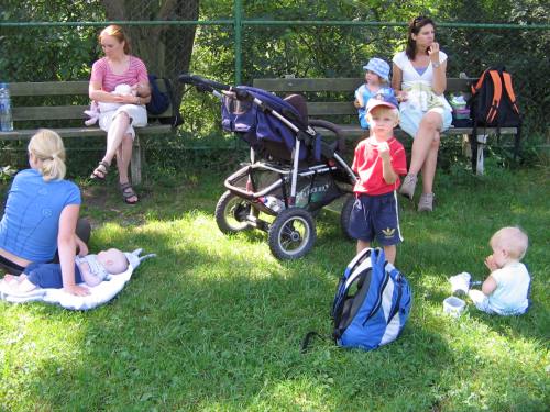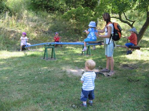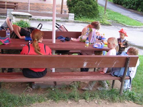 První prázdninový výlet vedl do Chotouně. Od herny se po modré turistické značce vydala skupinka vedená tatínkem Petrem Koutníkem přes Chotouňský potok na rozcestí Pod Drnkou. Pak se tatínek, tři maminky a celkem šest dětí, včetně dvouměsíční Esterky, vydali po červené turistické značce do Chotouně k Přibíkovu mlýnu. Tam se děti okamžitě vrhly na prolézačky, pískoviště i klouzačku. Bohužel restaurace byla ještě uzavřená, ale připravé svačiny zaplnily celý stůl a nikdo nehladověl. :) Hladem netrpěla ani místní koza, kterou děti vydatně nakrmily jetelem. Po odpočinku se všichni vrátili do Jílového po okružní trase přes silnici a rychle a statečně, i s kočárky, zdolali cestu vzhůru lesem a loukou až k lavičce Na Rakovce. Za fotbalovým stadionem se účastníci vycházky začali rozcházet domů. K příjemné atmosféře a zdaru celého výletu přispělo i lehce zatažené nebe. Délka trasy: do 4 km