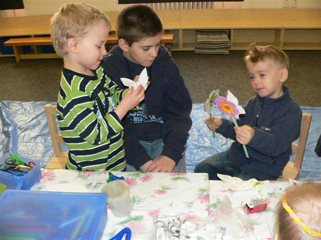 Patnáctka dětí s rodiči nebo babičkami si vyzkoušeli malování textilních kytiček, vytvořili malovaná vajíčka, skládaná kuřátka, a další výtvory s velikonoční tématikou.