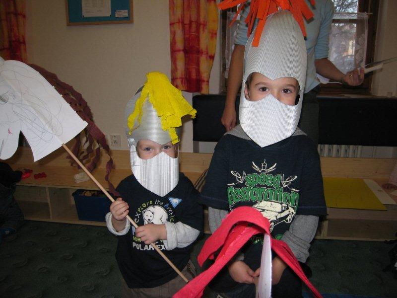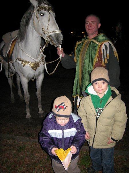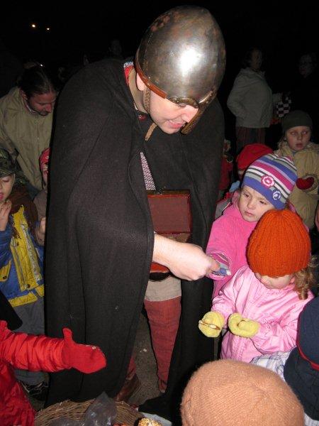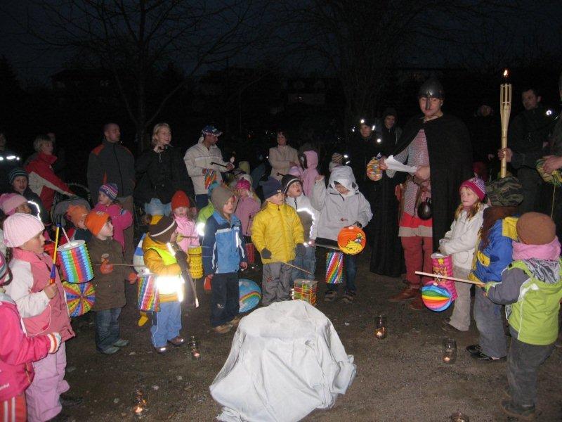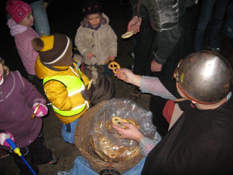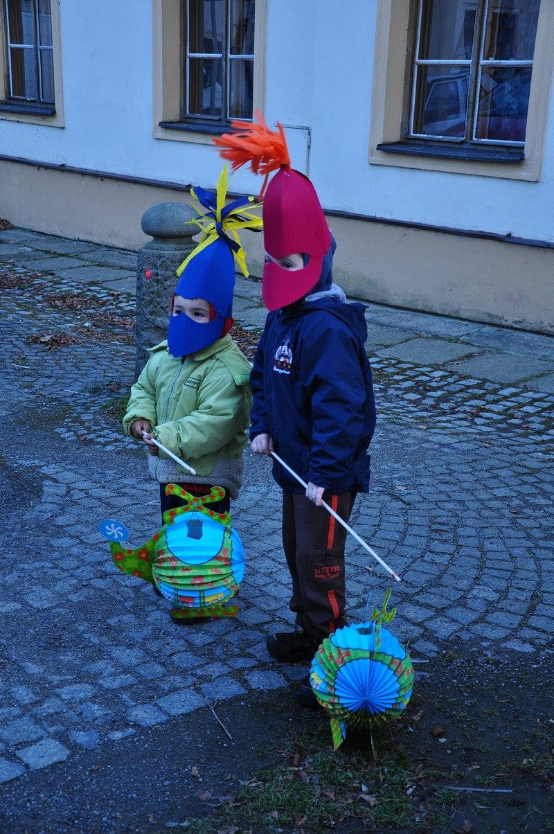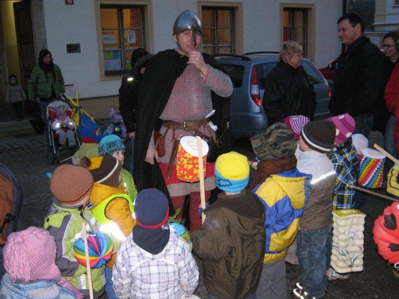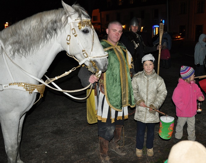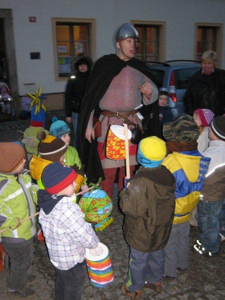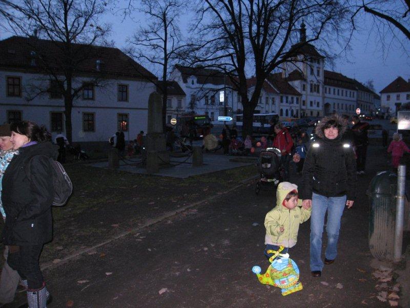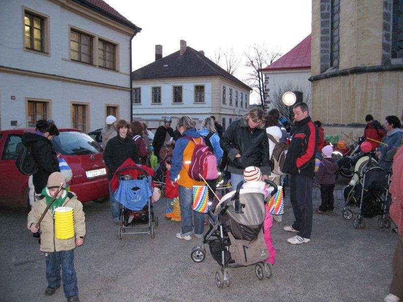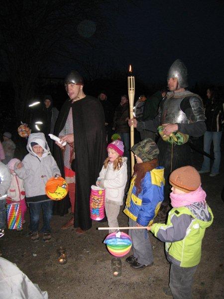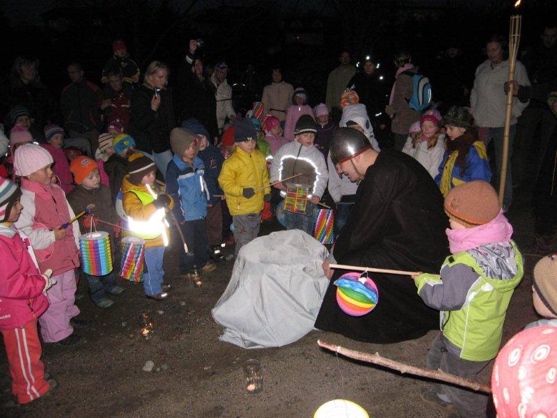 Tradiční lampiónový průvod vyšel letos na čtvrtek 11.listopadu, tedy přesně na svátek Sv. Martina. Před samotným průvodem proběhla v herně MC Permoníček výtvarná dílna, ve které si mohly příchozí děti vytvořit rytířskou helmu s chocholkou a papírovou hlavu koně na tyčce. Děti a zejména maminky si s vyráběním hravě poradily a najednou byla herna plná malých rytířů a jezdkyň na koni. Kolem čtvrté hodiny odpolední se pomalu začalo prostranství před ZUŠ zaplňovat zvědavými dětmi dřímajícími v rukách pestrobarevné lampióny. Na ně již čekal rytíř Jan, kamarád Sv.Martina s informací, že Sv. Martin, druh a kamarád jeho, se ztratil a bude potřeba ho najít, stejně tak jako poklad, který se někde po cestě nachází a o kterém se rytíř Jan doslechl. Děti byly natěšené, rodiče v očekávání. Bude letos kůň živý, či papírový? Během smrákání se průvod s rozsvícenými lampiony v čele s Janem vydal po stopách přes park za muzeem až na volné prostranství za ním. Zde byl objeven naditý poklad plný preclíků a čokoládových mincí. Po rozdání dobrot všem hodným dětem, co se rády dělí rytíř Jan spolu s pomocníkem a všemi dětmi zavolali na Sv. Martina, zda se neukáže. Pochvičce čekání a volání z temnoty přicválal Sv. Martin na bílém oři. Statný kůň svou bělostí zářil na celé okolí, ale sněhovou nadílkou nás neobdařil. Zato Sv. Martin povyprávěl o tom, jak se rytíř Martin svatým stal. Poté požádal svého věrného přítele Jana aby jemu i celému průvodu na cestu posvítil a v čele lampiónového průvodu se pak Sv. Martin a všechny děti s rodiči přesunuli zpět před MC. Permoníček. Tam si děti rozebraly poslední čokoládové mince a vyfotily se s koněm i Martinem.