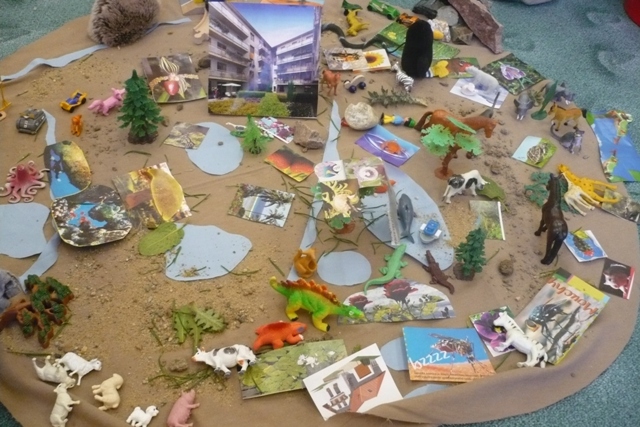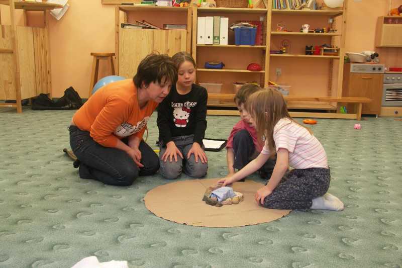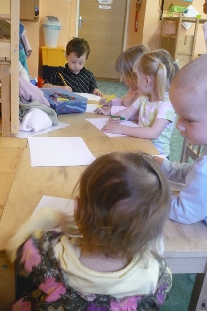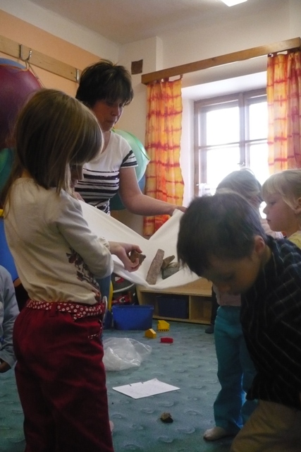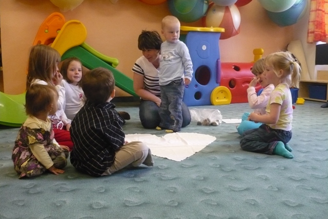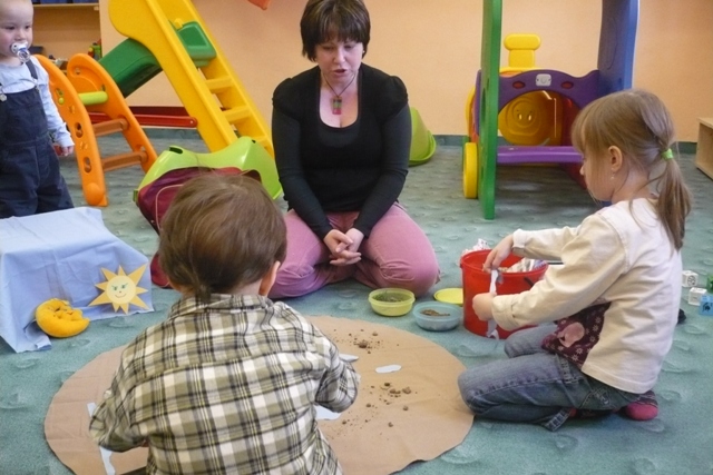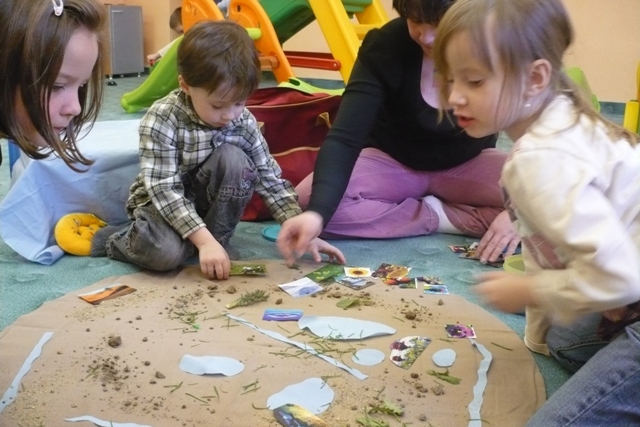 První setkání paní Iveta zahájila povídáním o tom, co vše jsme dostali darem - Slunce, hvězdy, Zem, skály, rostliny, zvířata,... i o tom, co jsme vytvořili my lidé (domy, stroje...). Děti i s rodiči si během kroužku vytvořili naši vlastní malou "Zemi" a připomněli si, že o vše nám svěřené máme pečovat a chránit to. Na závěr se všichni naučili pohybovou písničku "Kdo stvořil..."