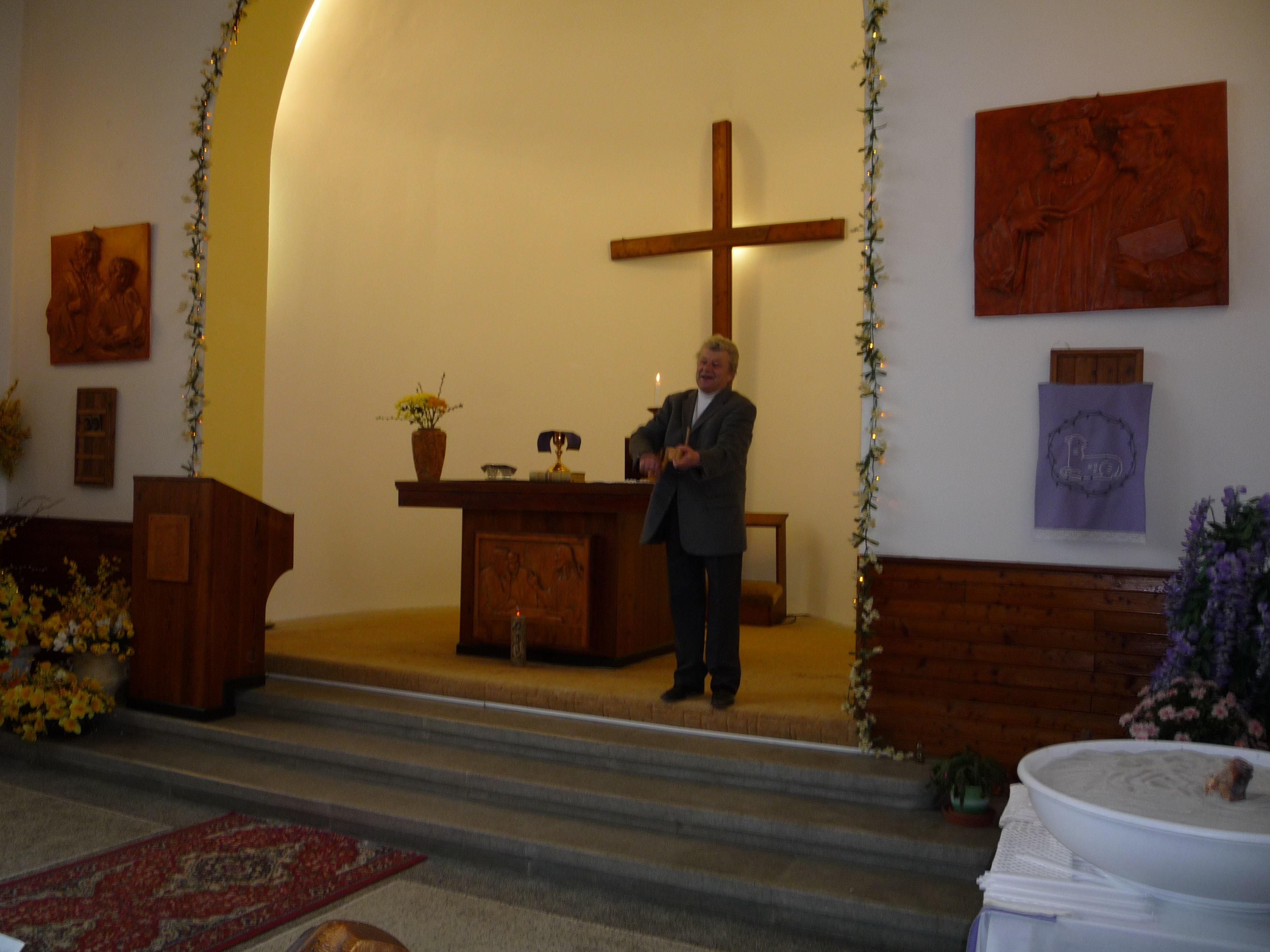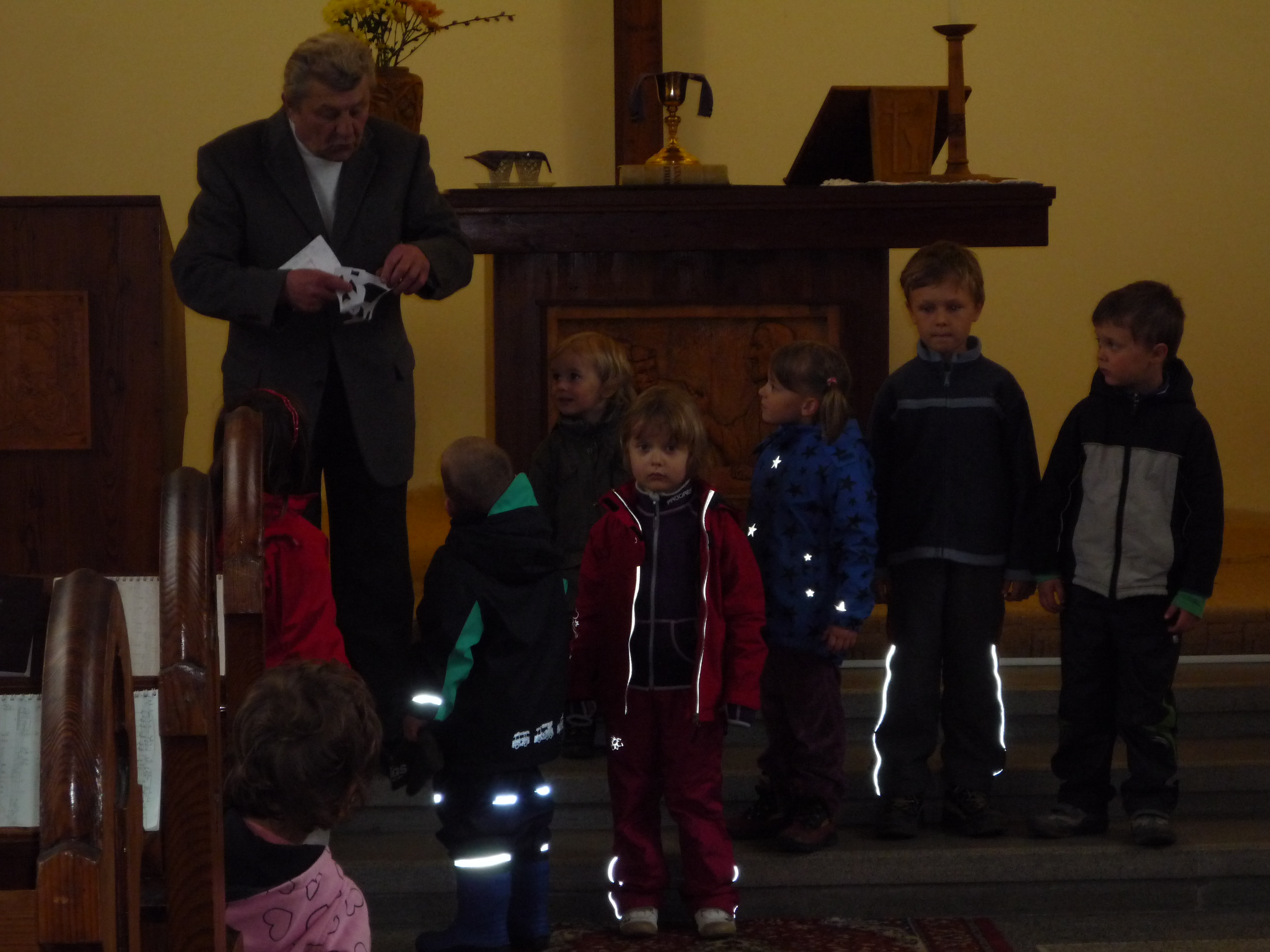 Ve čtvrtek 5.4. v 15 hodin jsme přijali pozvání pana faráře Polinského na návštěvu kostela církve českobratrské husitské. Pan farář vysvětloval dětem velice přístupným způsobem církevní tradici Velikonoc a ukázal jim různé řehtačky. Nakonec nás všechny pozval na prohlídku zahrady. Je škoda, že přišlo jen 6 rodin, ale počasí nebylo příliš příznivé.