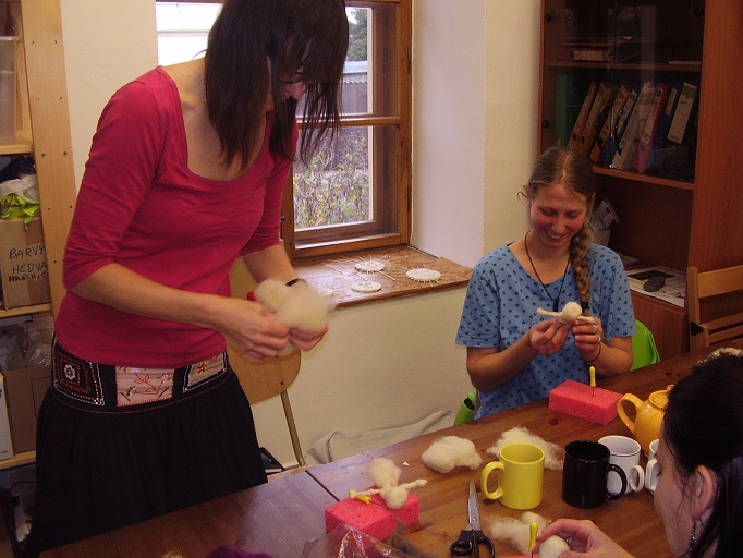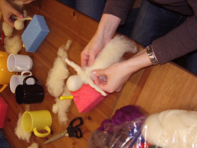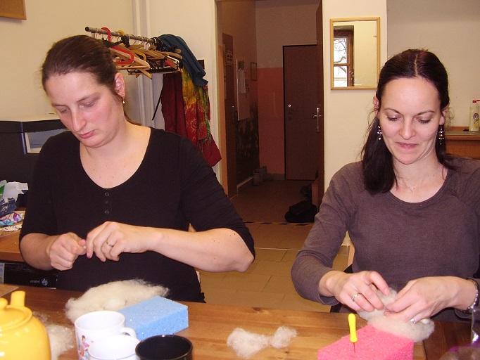 28.11. jsme se sešli a s lektorkou Martinou Chomátovou si vyrobily andílky z ovčí vlny. Práce s vlnou a plstícími jehlami je velmi uklidňující a v podstatě jednoduchá a vznikají zajímavé věcičky. Na práci jsme se mohly soustředit, protože v herně nám Gábina hlídala dětičky. Všem se kurz moc líbil a určitě budeme zkoušet plstění i doma.