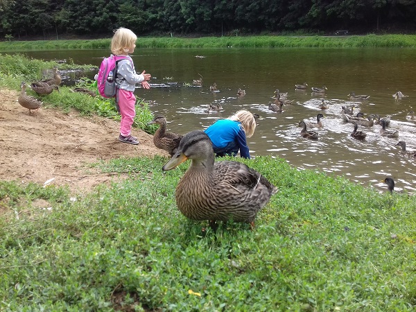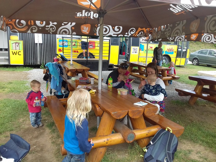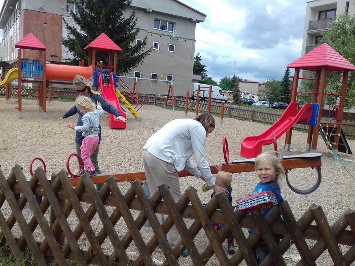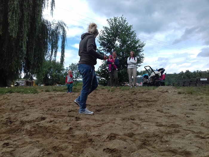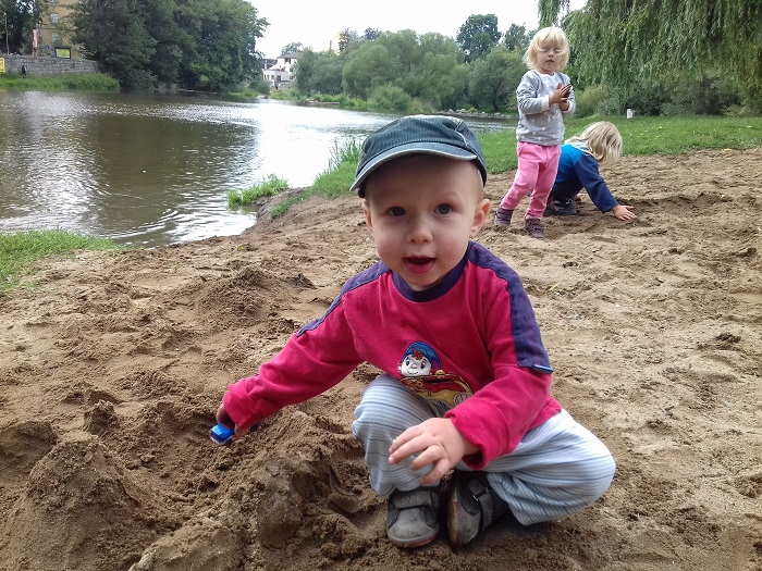 Po dobrém obědě jsme se vydali k řece do kempu nakrmit kačenky, postavit hrad z písku... Nejvíce se dětem líbila pyramida z palet, na které se dalo skvěle řádit, posilovat svaly, maminčin postřeh a trpělivost. Zabráni do hry jsme si ani nevšimli, jak nastal čas odjezdu vlaku v 16.30. Tak celá skupina maminek v rychlosti nastartovala kočárky a vlak jsme přece jen stihli.