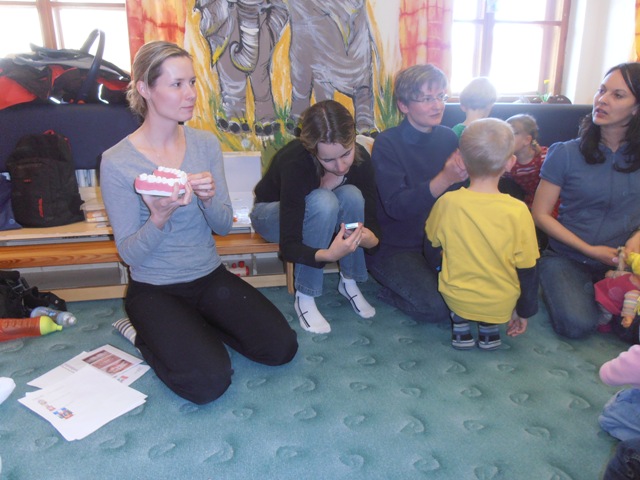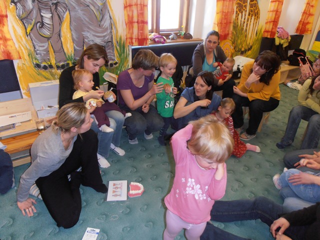 Ve čtvrtek 12.4. od 16.00 se sešlo 15 maminek se svými dětmi v herně MC, aby si poslechlo povídání zdravotní sestry na téma Péče o zoubky dětí – kdy navštívit poprvé zubního lékaře, jak čistit zoubky, zlozvyky zvyšující riziko vzniku zubního kazu, jak vybrat správný zubní kartáček. I přes velké množství účastníků myslím, soudě dle různých dotazů, že si každá maminka odnesla odpovědi na to, co je zajímalo. Účastníci dostali malé dárky od firmy Elmex a Meridol.