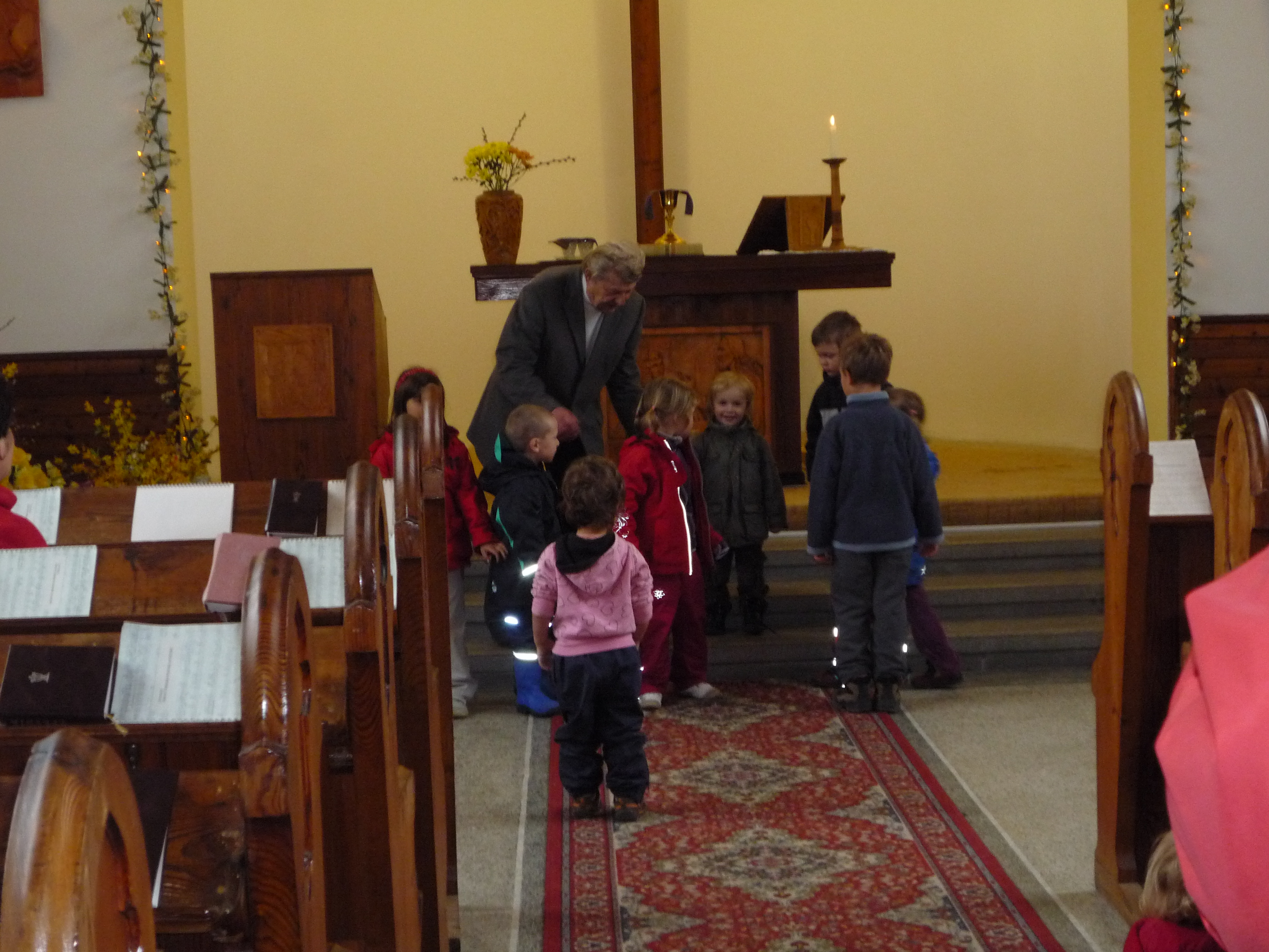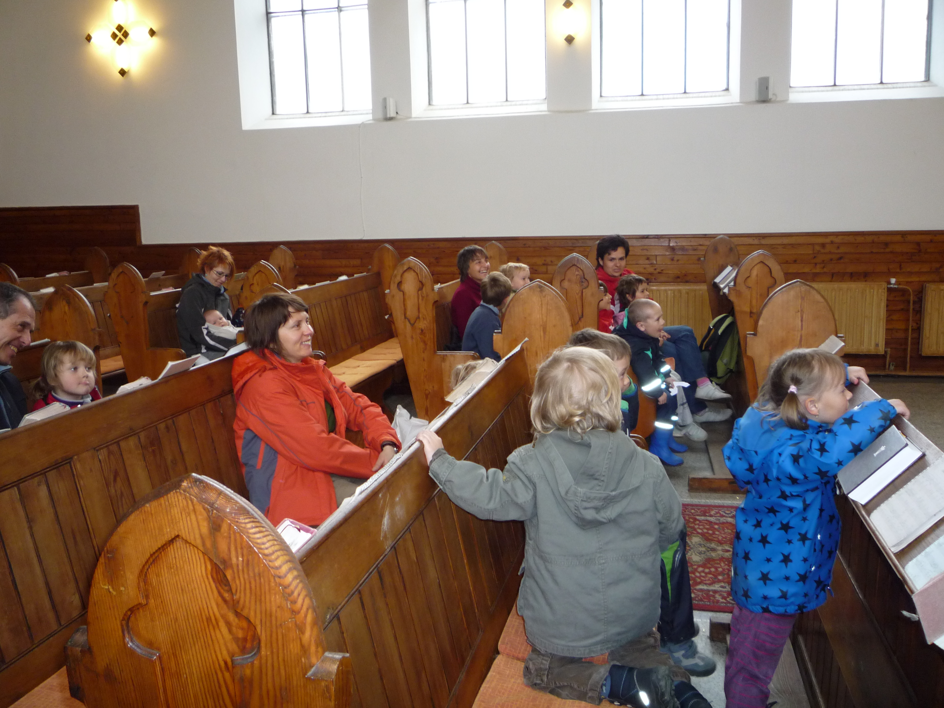 Ve čtvrtek 5.4. v 15 hodin jsme přijali pozvání pana faráře Polinského na návštěvu kostela církve českobratrské husitské. Pan farář vysvětloval dětem velice přístupným způsobem církevní tradici Velikonoc a ukázal jim různé řehtačky. Nakonec nás všechny pozval na prohlídku zahrady. Je škoda, že přišlo jen 6 rodin, ale počasí nebylo příliš příznivé.